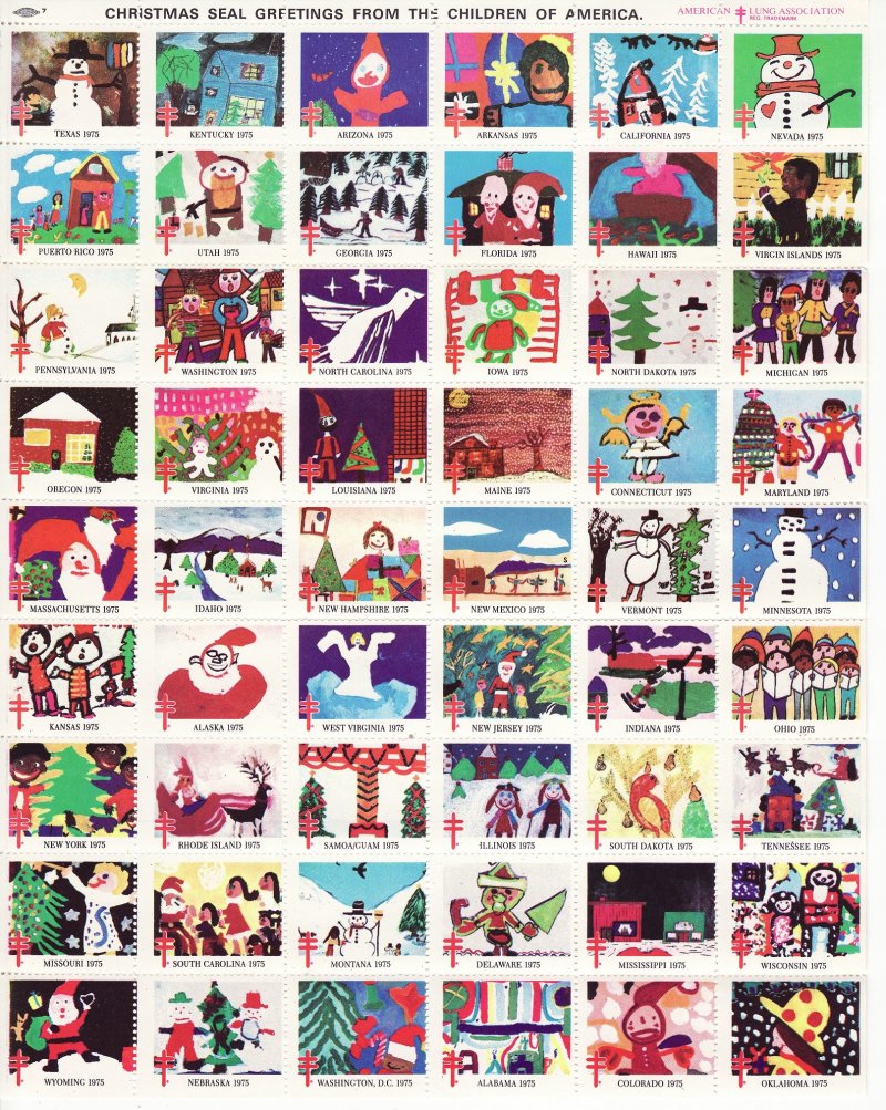 | 1975 U.S. Christmas Seal Sheets: Issued 1975 by the American Lung Association (ALA). The 1975 U.S. Christmas Seals were designed by school children from each state, Puerto Rico, Virgin Islands, D.C. and Guam. All U.S. Christmas Seal Sheets identified by Green's Part 1 Catalog numbers and Scott Catalog numbers. We have identified and cataloged the following sheets: |