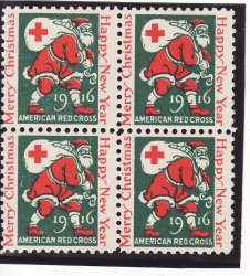 16-1, WX18, 1916 U.S. Christmas Seals Block of 4, FV, full gum, MNH. Issued by the American National Red Cross. Designed by Thomas M. Cleland. Image of Santa, Red and green, perf. 12