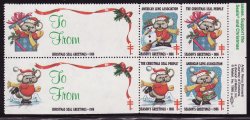 86-T4, 1986 U.S. Test Design Christmas Seals, As Required, VF, MNH. Issued 1986 by the American Lung Association (ALA). Designed by Remo Bramanti. Image of Koala with snowman, package, drum, skates. Block of six (6) multicolored seals.