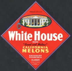 White House Brand California Melons Sign from Kavanagh Distributing Co., Los Angeles, California. Sign with image of the White House.