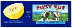 Pony Boy Brand California Honeydew Melons Crate Label. Vintage original crate label from Rose Valley Produce Co., Woodland, Calif. Image of two boys on a pony with cowboys hats, and half a melon.