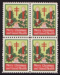 1925-3, WX37, 1925 U.S. Christmas Seals Block, perf. 12 1/2, full gum, F, MNH. Issued 1925 by the National Tuberculosis Association (NTA). Designed by Robert G. Eberhard. Image of candles.