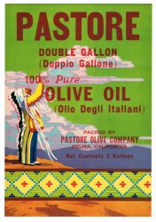 Pastore Olive Oil Can Label. Original label from the Pastore Olive Oil Company, Selma, California. Image of Native American raising his hands to the sky.