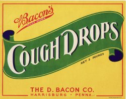 Bacon Brand Cough Drops Crate Label, 1910s. Vintage, original, unused label from The D. Bacon Co., Harrisburg, Penna. Shipped flat in a sturdy envelope. Ready to frame.