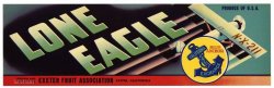 Lone Eagle Brand California Grape Crate Label. Orignal vintage label from the 1940s with text "Grown and Packed by the Exeter Fruit Association in Exeter, California." Image of the Charles Lindberg Lone Eagle plane.