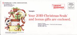 119-1.2env, 2019 ALA National Design U.S. Christmas Seal Renewal Campaign, Washington Return Address, VF, MNH. Envelope of products from the ALA, which contains one sheet of 2019 National Design Christmas Seals, 2019 Gift Tags and Address Labels, 2020 Pocket Planner, 2019 Sample Annual Christmas Seal Renewal Letter and a return envelope, Lewiston, Maine remittance address.