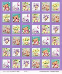 122-ST3x, 2022 ALA Test Design U.S. Spring Charity Seals Sheet, R22-EFAS-4-15, VF, MNH. Issued 2022 by the American Lung Association (ALA). Designed by Makiko/artlicensing.com. Images of teddy bear with flowers, bunny and butterfly, bunny and chicks, bear and flower bouguet, puppy and flowers, chicks and daffodils. Images are framed in green, within a violet margin.