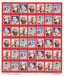 123-T1, 2023 ALA Test Design U.S. Christmas Seals, As Required Strip of 7 Designs, VF, MNH. Issued 2021 by the American Lung Association (ALA). Designed by Makiko/Art Licensing. Images of Santa, dancing penguins, teddy bears, chipmunks, dog, snowman. Multicolored, self-adhesive, serpentine die cut, trimmed in white, within red border, all upon a white background. "Christmas Seals 2023" at top of each Christmas Seal.