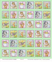 124-S1x, 2024 ALA National Design U.S. Spring Charity Seals Sheet, R43-EFAS-4-01. Sheet of 36 seals, self-adhesive, VF, MNH. Issued 2024 by the American Lung Association (ALA). Designed by Helen Brindley/Image by Design. Images of bear cub with flowers, bunny, dog, cat with kitten, flowers, and chicks in a cup. Image of Cross of Lorraine with text "American Lung Association" at bottom margin of each seal. Images are framed in rose within a pale green margin.