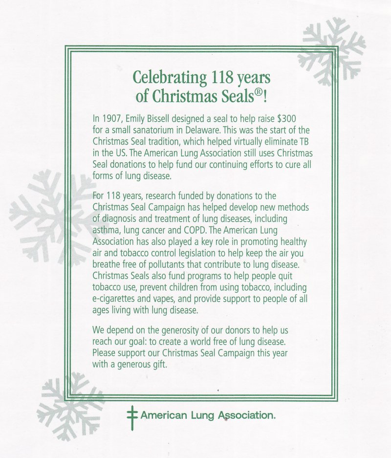 "Celebrating 118 years of Christmas Seals ..." on the reverse of sheet.