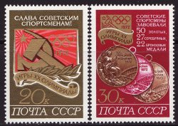 Russia 4026-27, Russia Stamps Soviet Olympic Emblem & Laurel. Images of Soviet Olympic Emblem, and obverse of gold, silver, and bronze medals. Issued 1972, multicolored, perf. 111/2, full gum, VF, MNH.
