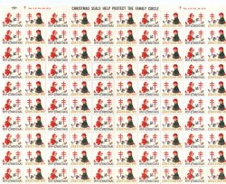 Sheet of 100 (10x10), yellow, red, green, and black. Seal size: 23x16mm. Printer's Mark: "B" located behind the boy above his foot on seal #56. Union label on margin. Perforated margin at top inscribed, "Christmas Seals Help Protect The Family Circle."