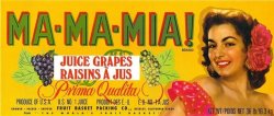 MA-MA-MIA California Juice Grapes Crate Label. Vintage, original crate label from Fruit Basket Packing Co., Reedley, California. Image of woman and grapes.