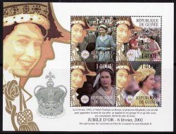 Guinea 2123, Queen Elizabeth II, Golden Jubilee, Sheet/4. Issued 2002, celebration of Queen Elizabeth II's Golden Jubilee. Multicolored, full gum, perf. 141/4, VF, MNH.