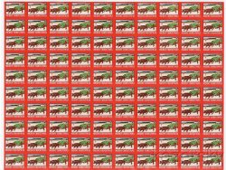 Sheet of 100 (10x10) seals. Colors: red, green, brown, and blue. Seal size: 22x17mm. Printed by Eureka Specialty Printing Co.