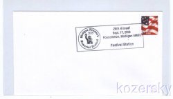 Fireman's Memorial Pictorial Postmark, Topical Cancel. Unique pictorial postmark from the Michigan Fireman's 2005 Memorial 26th Annual Festival Station, Roscommon, Michigan 48653. Graphic of circle with fireman within. Postmarked September 17, 2005. Envelope is franked with a Flag Stamp. Postmark is on a clean, white, unaddressed, #6 envelope.