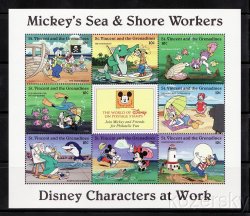 St. Vincent 2253a-i, Disney Mickeys Sea & Shore Workers Stamps, Sheet of 8 stamps, VF, MNH. Disney sheet of eight (8) stamps, titled "Mickey's Sea & Shore Workers" from the Disney Characters at Work series.
