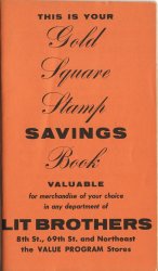 Gold Square Trading Stamps Saver Book, Mint. Vintage, original, unused Saver Book used to save Gold Square Trading Stamps issued by Lit Brothers and other merchants in the Philadelphia, PA area. Gold Trading Stamp Company, Philadelphia 5, PA. Book was issued prior to ZIP codes.