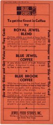 Profit Sharing Trading Stamps could be placed on both sides of the card. One side of the card has advertising for Jewel Food Store products - Royal Jewel Coffee, Blue Jewel Coffee, and Blue Brook Coffee. Other side indicates how to redeem Profit Sharing Stamps.