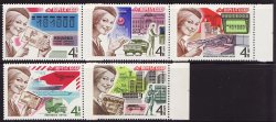 Russia 4619-23, Russia Stamps Postal Official and Postal Code Stamps. Issued 1977, images of postal workers and mail processing, multicolored, perf. 121/2x12, full gum, VF, MNH.
