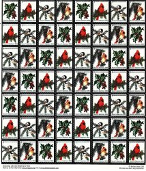 2003-6x, 2003 U.S. National Christmas Seals Sheet, self-adhesive, VF, MNH. Issued 2003 by the American Lung Association (ALA). Sheet of 56 (8x7) seals, no gift tags. Four designs of Cardinals, Holly and Chickadees. Black text, silver margin.