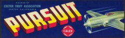 PURSUIT Brand Grape Crate Label, Exeter FRuit Association, Exeter, California. Original, PURSUIT Grape Crate Label from the 1940s. Graphic of a single prop fighter plane.