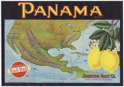 Panama Brand Lemon Crate Label, Crate label from Johnston Fruit Co., Santa Barbara, California. Image of shipping routes through the Panama Canal.. This original, mint 1940s label measures 8.75x12.25 inches.