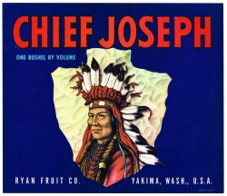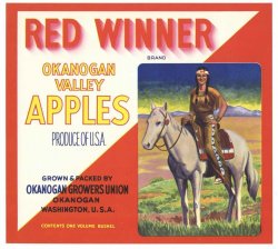 Red Winner Brand Washington Apples Crate Label. Original vintage crate label from Okanogan Growers Union, Okanogan, Washingtom. Image of Native American maidan on a horse.