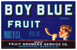 Boy Blue Brand Washington Fruit Crate Label. Original, unused stock in excellent condition from the Fruit Growers Service Co. in Wenatchee, Wash. Image of a young red cheeked boy blowing a horn.