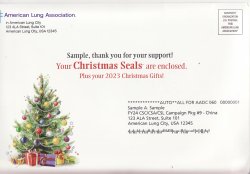 123-1.0pac, 2023 Sample ALA National Design U.S. Christmas Seal Annual Packet, American Lung City, USA Return Address, VF, MNH. Packet of products from the American Lung Association (ALA), which contains one sheet of 2023 National Design U.S. Christmas Seals, one sheet of 2023 Gift Tags and Address Labels, three (3) Christmas Cards, Note Pad, and 2023 Sample Annual Christmas Seal Campaign Letter and return envelope. Price: $15.75 Sale Price: $14.18 You Save: $1.57 (10%)