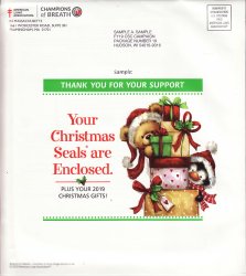119-1.6pac, 2019 ALA National Design U.S. Christmas Seal Annual Packet, Massachusetts Return Address, VF, MNH. Packet of products from the American Lung Association (ALA), which contains one sheet of 2019 National Christmas Seals, one sheet of gift tags, one sheet of stickers and mailing labels, 2020 Christmas Seals Themed Calendar, Memo Pad, 2019 Sample Annual Christmas Seal Campaign Letter and return envelope. Price: $19.75 Sale Price: $17.78 You Save: $1.97 (10%)