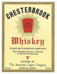 Chesterbrook Brand Whiskey Label. Vintage, original whiskey label from The American Liquor Company, Boston, Massachusetts. "Colored and flavored with woodchips."