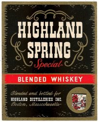 Highland Spring Blended Whiskey Label. Vintage, original whiskey label from Highland Distilleries, Inc. Boston, Massachusetts. Very nice details with gilding around the label edge.