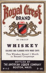 Royal Crest Brand Whiskey Label. Vintage, original whiskey label from The American Liquor Company, Boston, Massachusetts. "Colored and flavored with woodchips." Image of a crest.