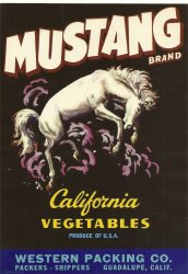 Mustang Brand California Vegetable Crate Label, 7x9 inches. Vintage, original label from Western Packing Co., Guadalupe, Calif. Image of a mustang horse.