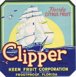 Clipper Brand Florida Citrus Fruit Crate Label. Original vintage crate label from the Keen Fruit Corporation, Frostproof, Florida. Image of a Clippeer ship, with the sun in the background.